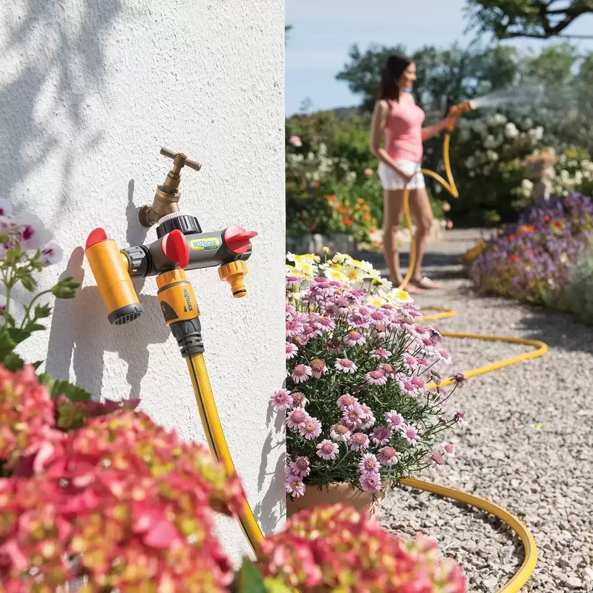 The 3-Way Tap Connector allows you to connect two watering devices or hose pipes directly to one outside tap and has a third, permanently accessible outlet that rotates to allow water to be directed into a bucket or watering can.