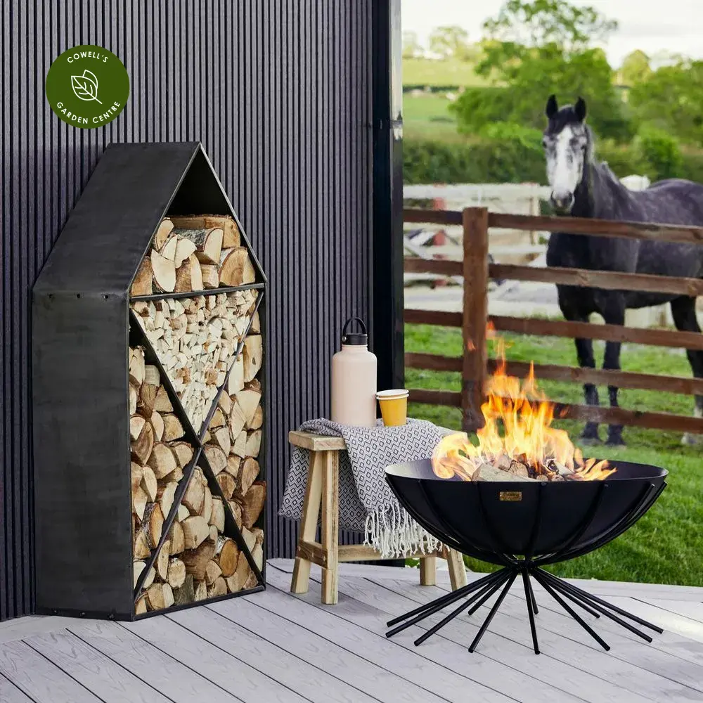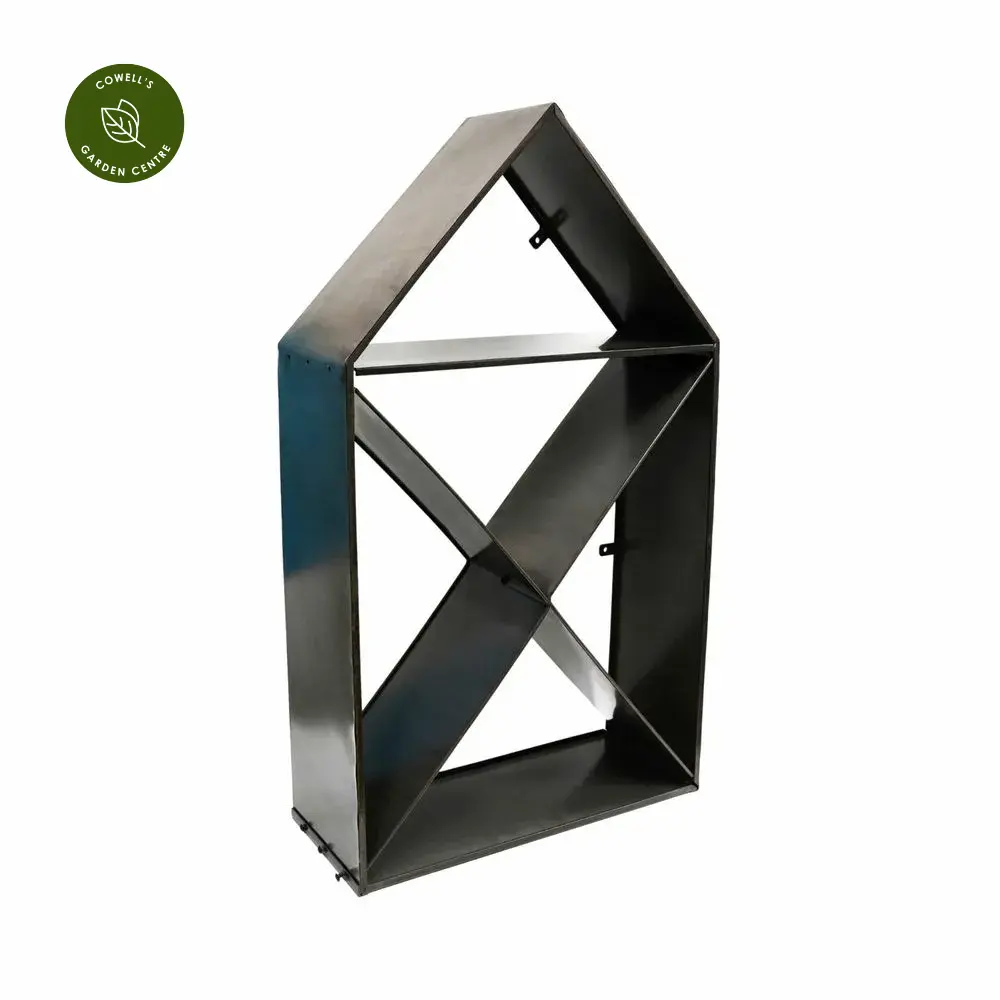 The Ivyline House log storage sculpture in natural black provides a modern twist to your outdoor area. Made of premium quality metal and with the added benefit of a protective black coating, the House metal log store is hardened against frost and well-suited to life outdoors. Different sized compartments make it ideal for arranging logs and kindling in a variety of shapes, and its angular lines create an excellent aesthetic when it’s attached to a wall.