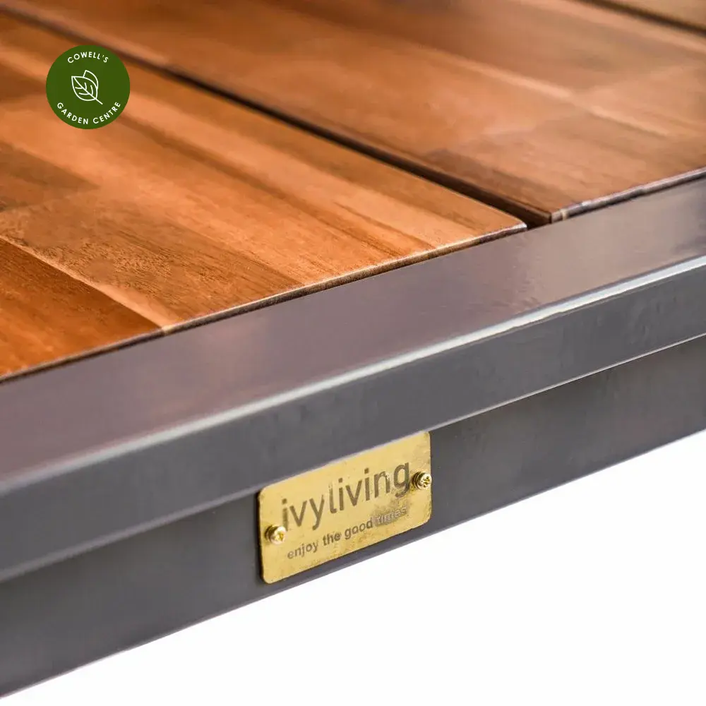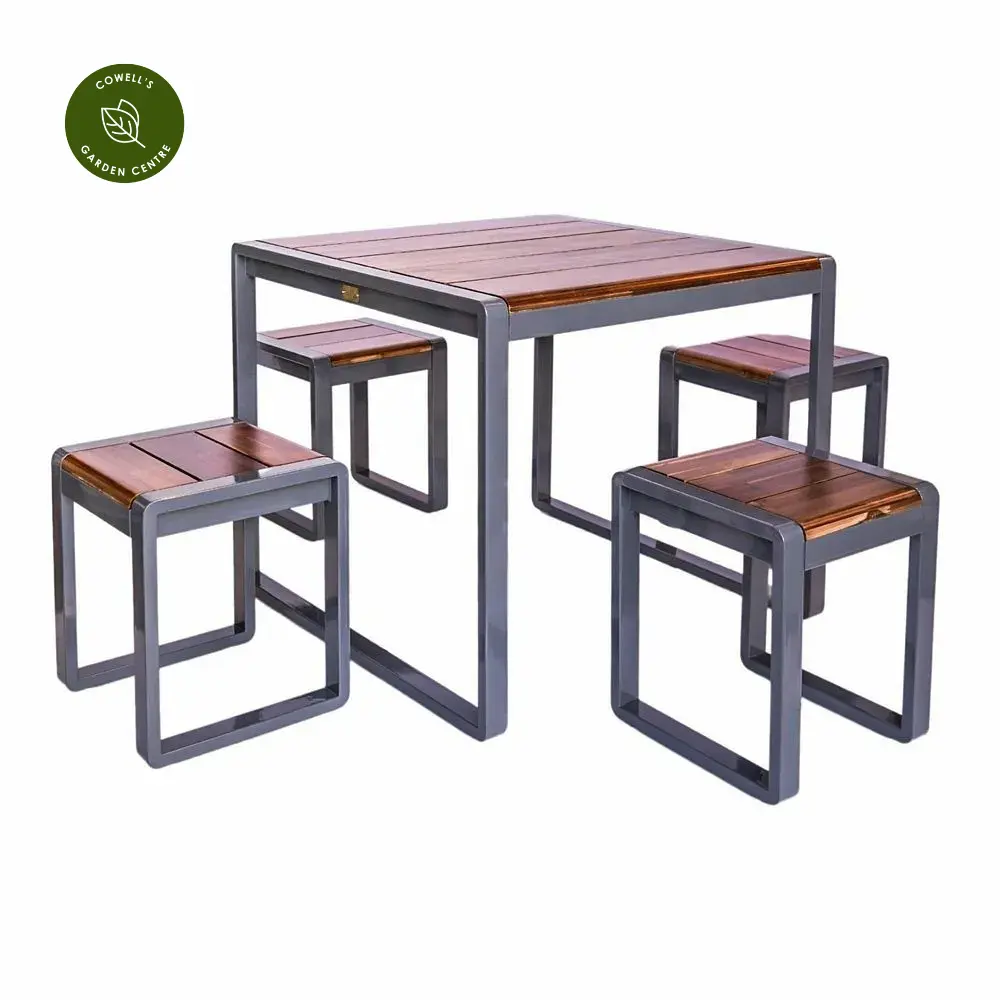 Made from durable acacia hardwood and robust frames finished with a kiln-baked protective powder coating, the Spitalfields Square 5-piece furniture set makes for the perfect social setting for up to 4 people. Ideal for the garden and conservatory for use all year round.
