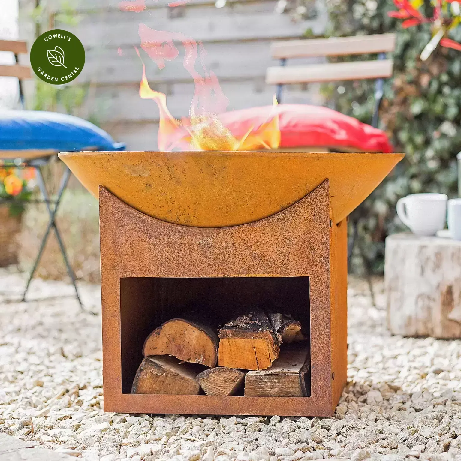 Made from a mix of cast iron and steel, the Fasa fire pits have a natural oxidised finish and the bowl offers a 360° view of the fire. The design features a clever log store beneath, adding contemporary charm whilst being highly practical.